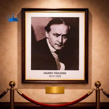 The magician introduces an elegant frame containing a photograph of Harry Houdini, the Master of the Impossible. Everything feels classic, almost like a museum piece. A spectator freely selects a card from the deck without revealing it.
